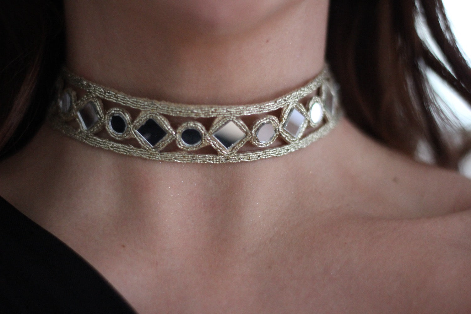 Producto hecho a mano utilizando hilos dorados, metalizados y de oro rosado con pequeñas piezas de espejo engarzadas en los tejidos.