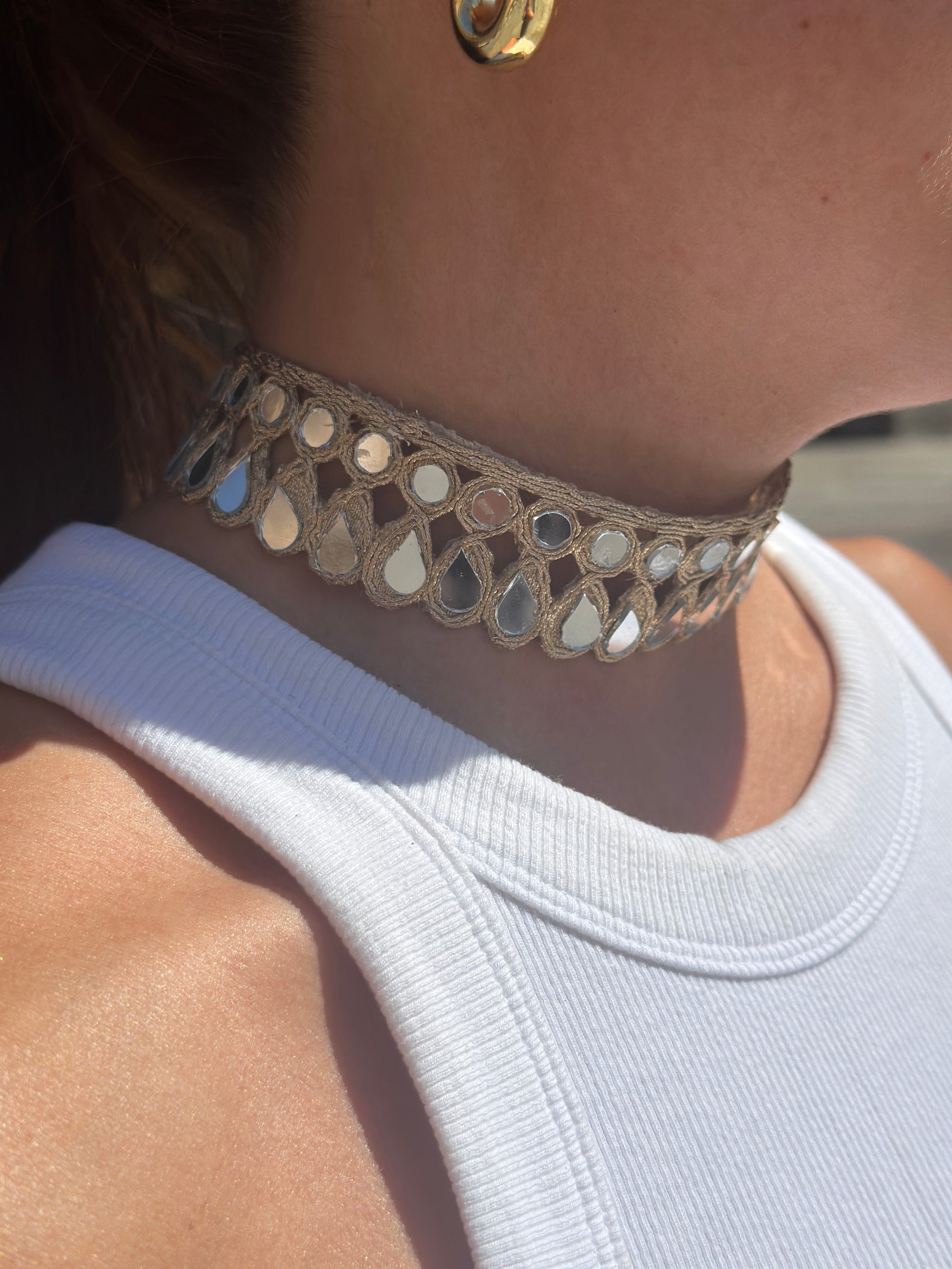 Producto hecho a mano utilizando hilos dorados, metalizados y de oro rosado con pequeñas piezas de espejo engarzadas en los tejidos.