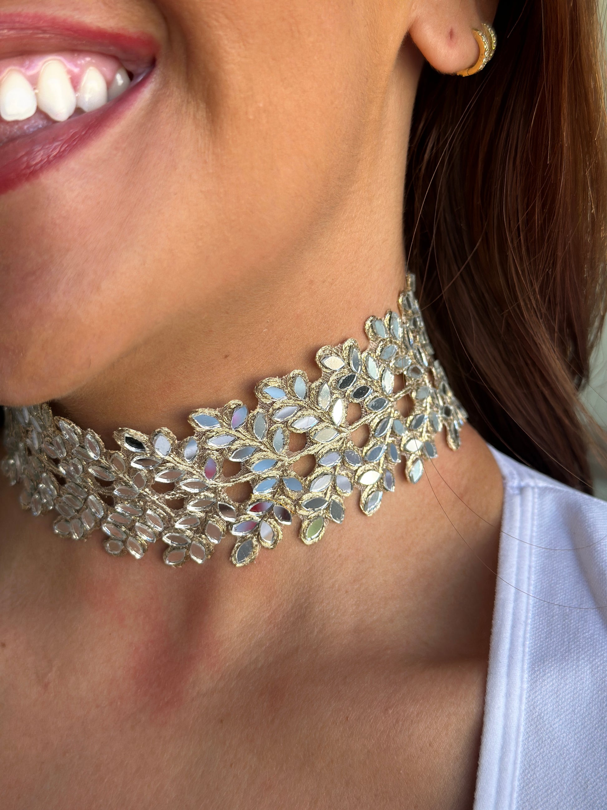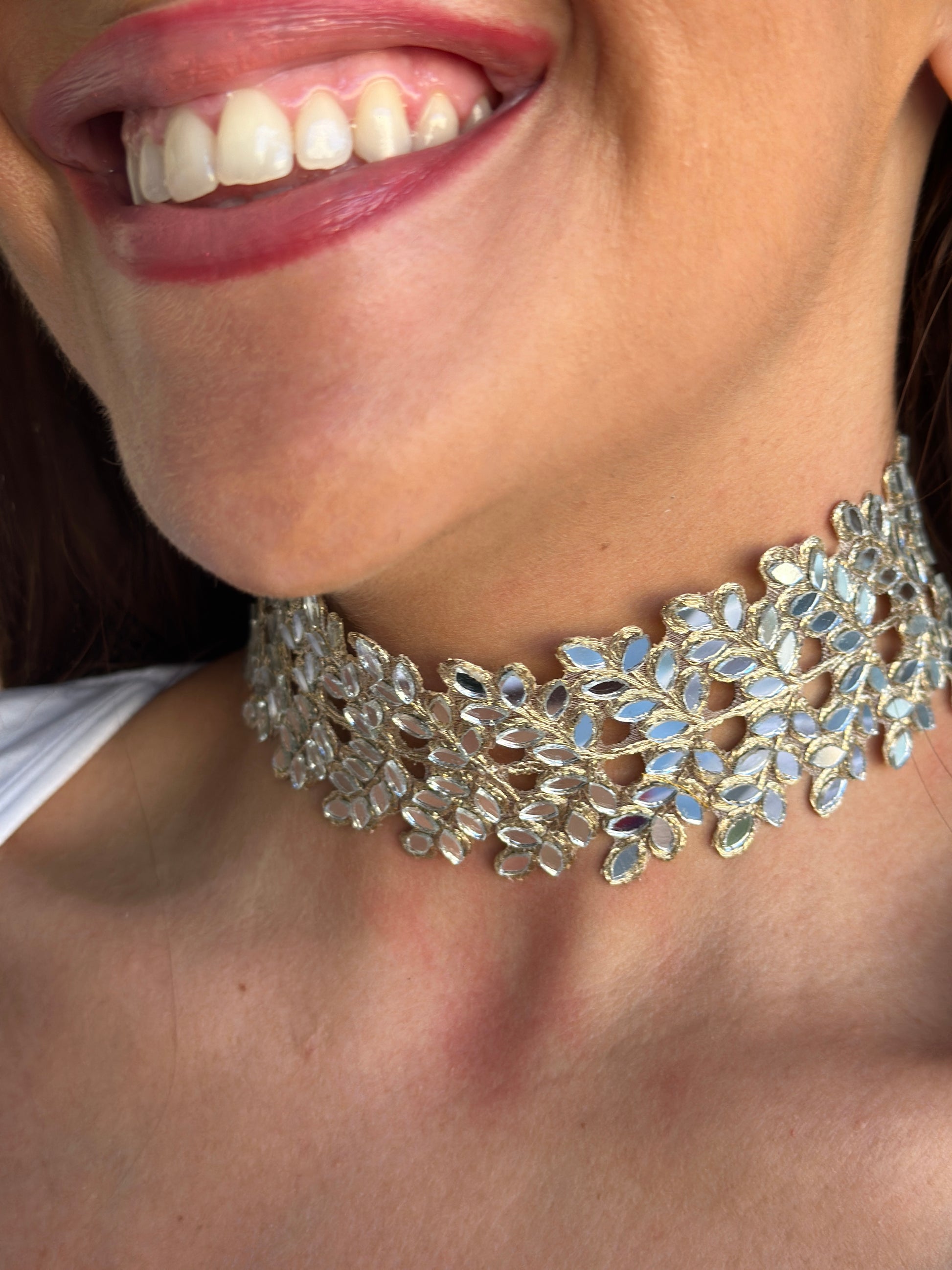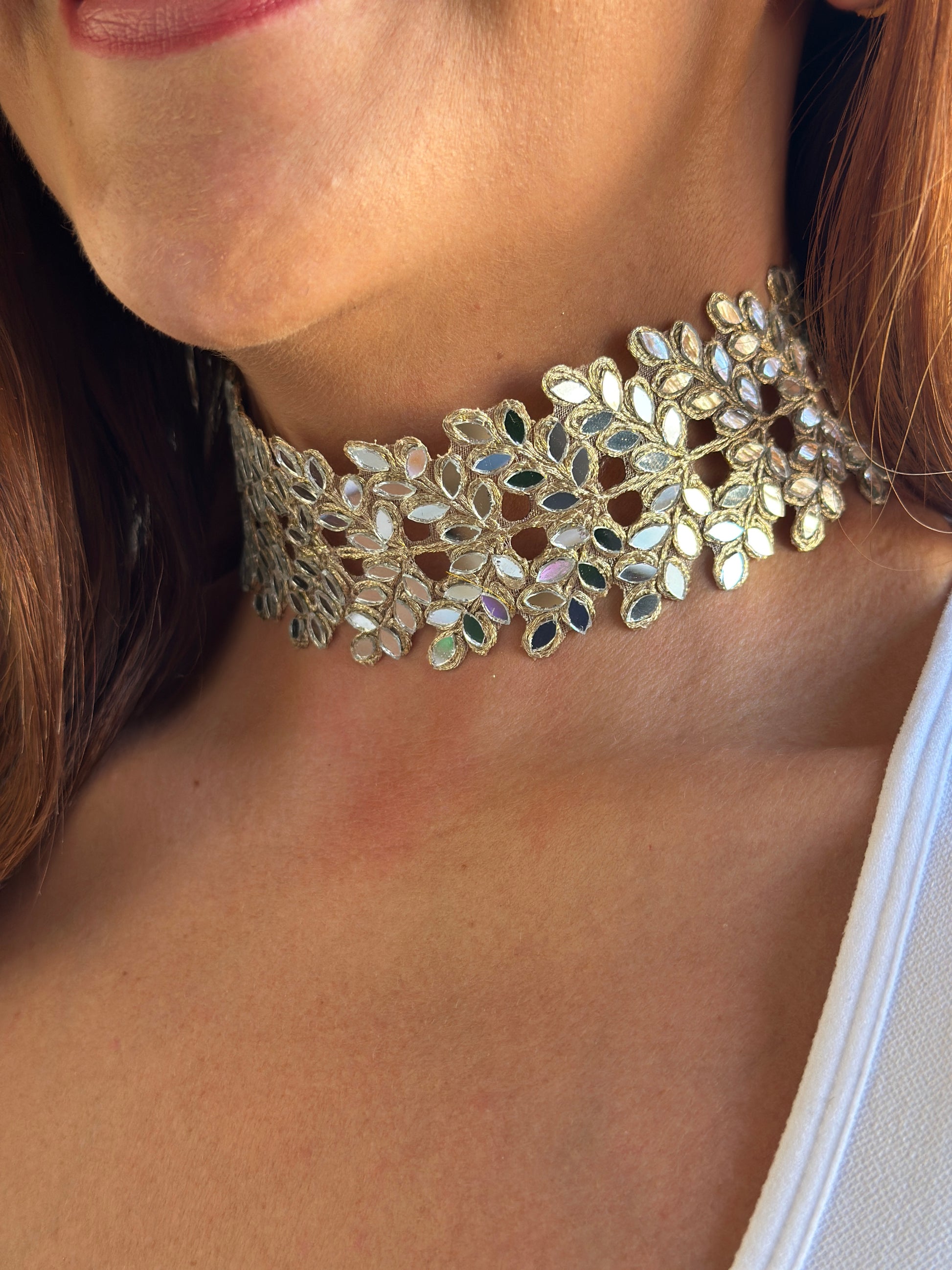 Producto hecho a mano utilizando hilos dorados, metalizados y de oro rosado con pequeñas piezas de espejo engarzadas en los tejidos.
