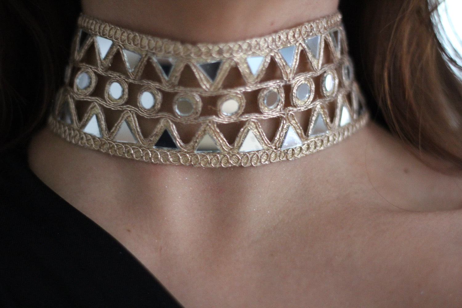 Producto hecho a mano utilizando hilos dorados, metalizados y de oro rosado con pequeñas piezas de espejo engarzadas en los tejidos.