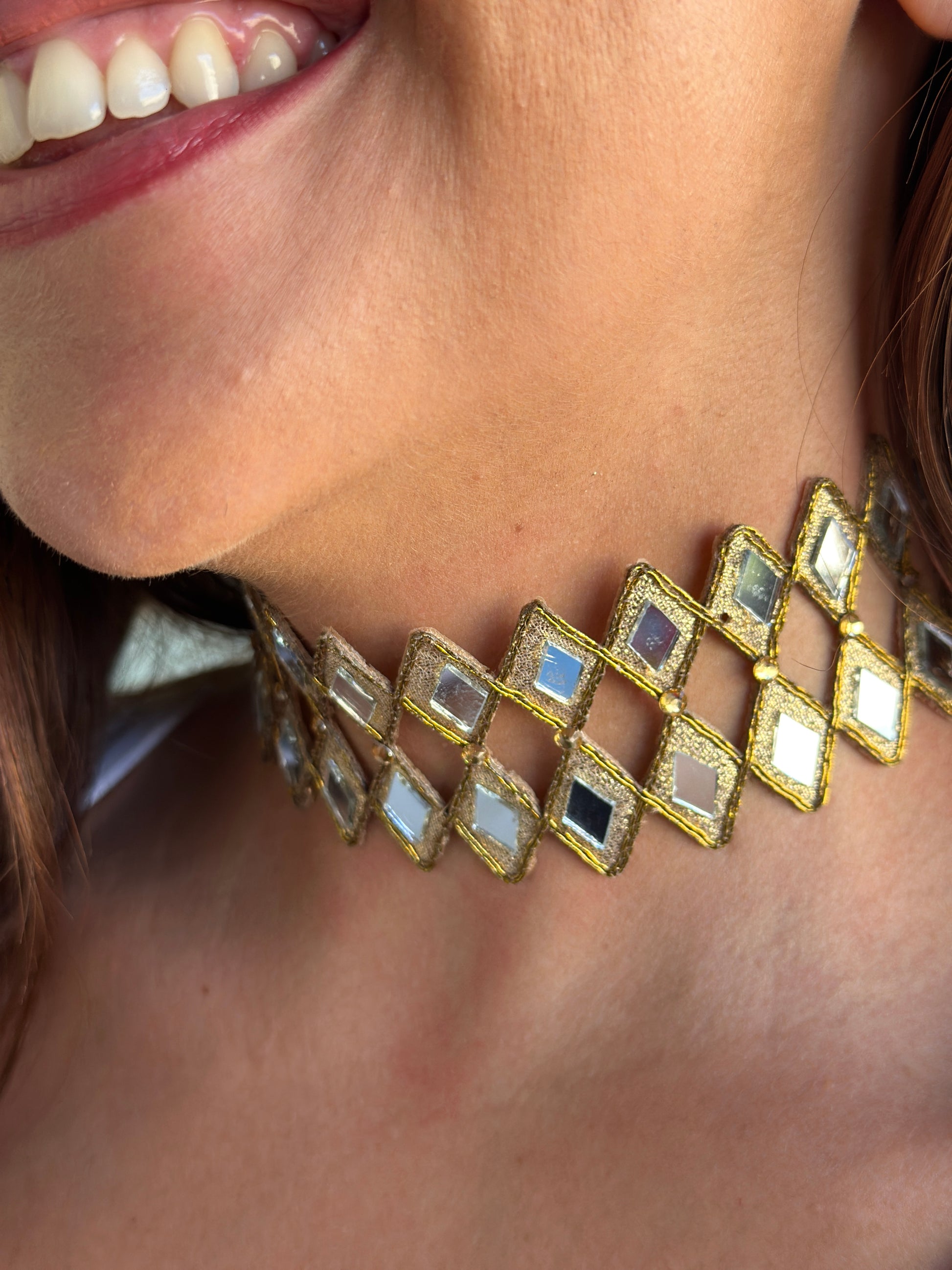 Producto hecho a mano utilizando hilos dorados, metalizados y de oro rosado con pequeñas piezas de espejo engarzadas en los tejidos.