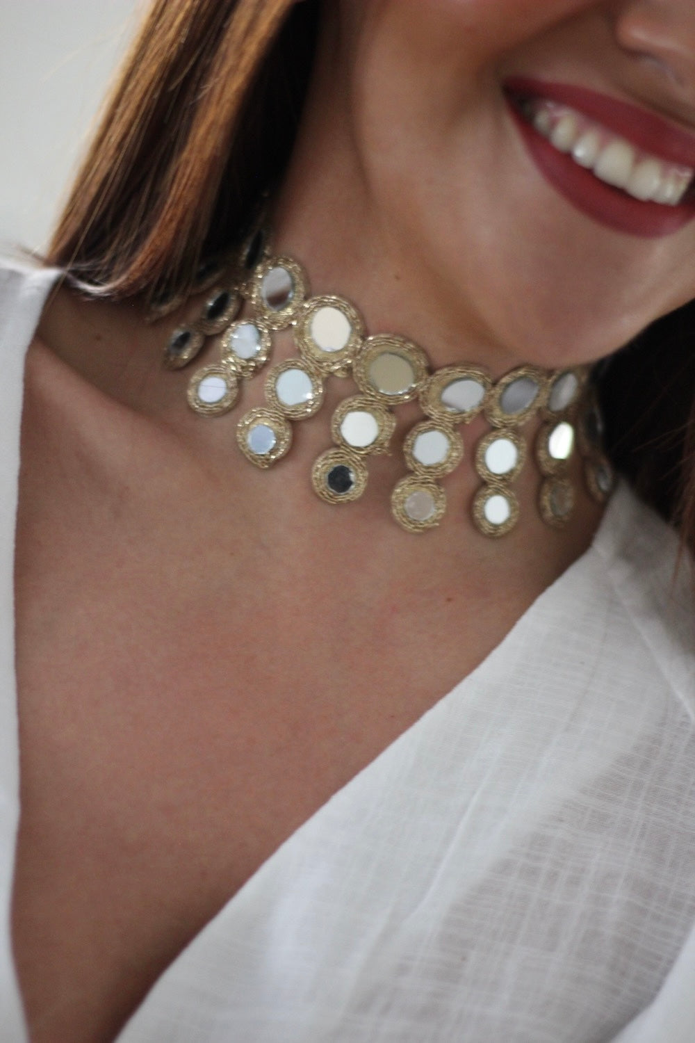 Producto hecho a mano utilizando hilos dorados, metalizados y de oro rosado con pequeñas piezas de espejo engarzadas en los tejidos.