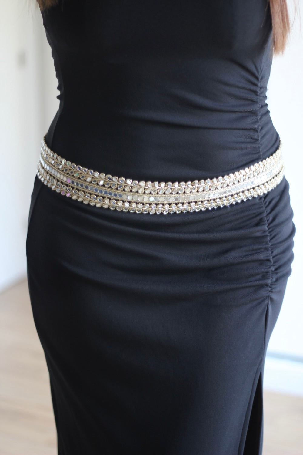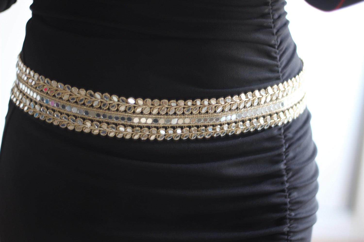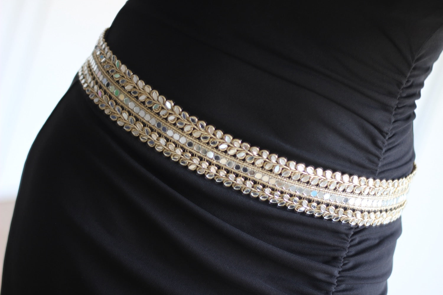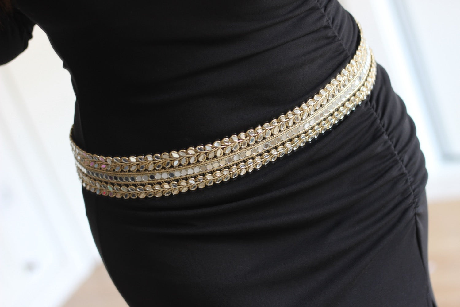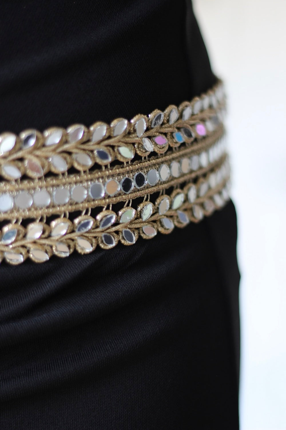 Producto hecho a mano utilizando hilos dorados, metalizados y de oro rosado con pequeñas piezas de espejo engarzadas en los tejidos.