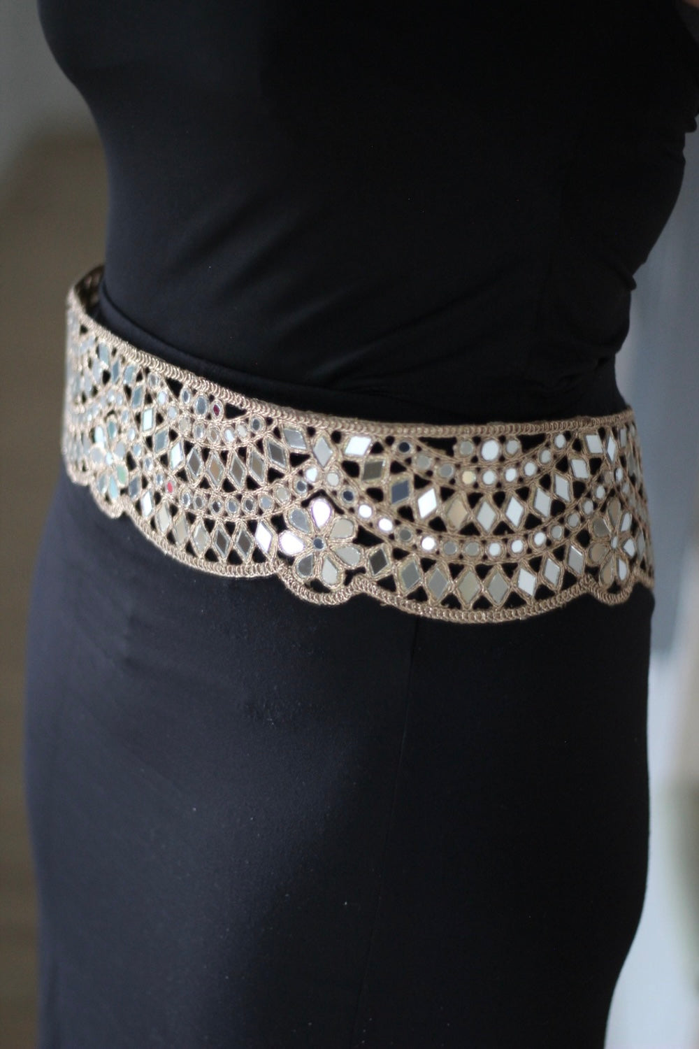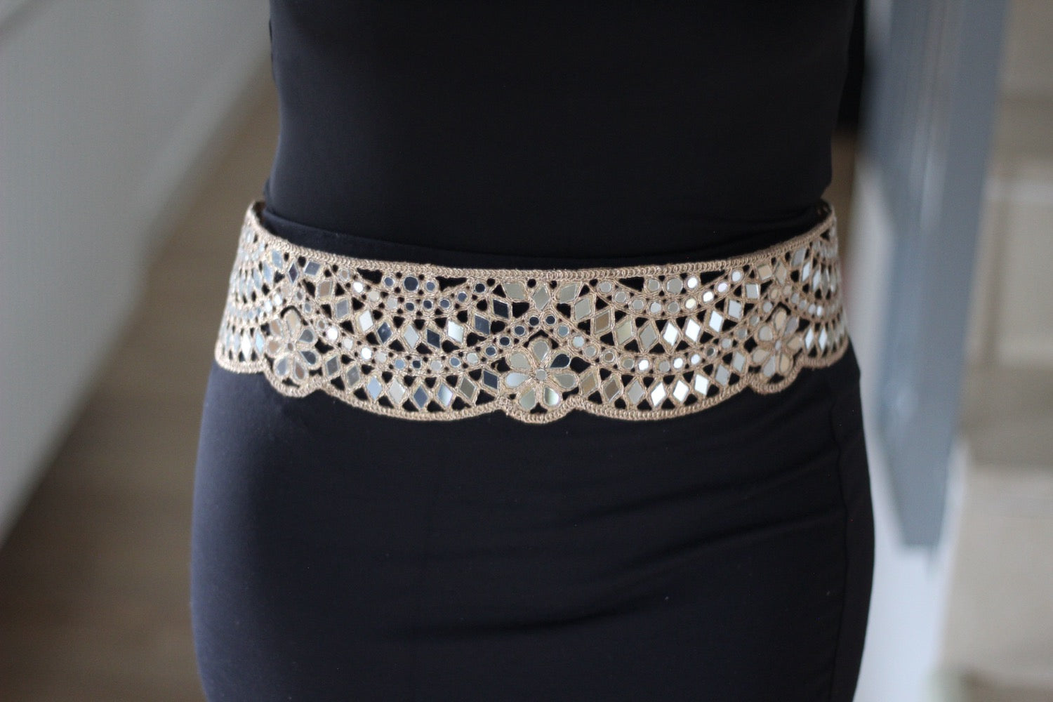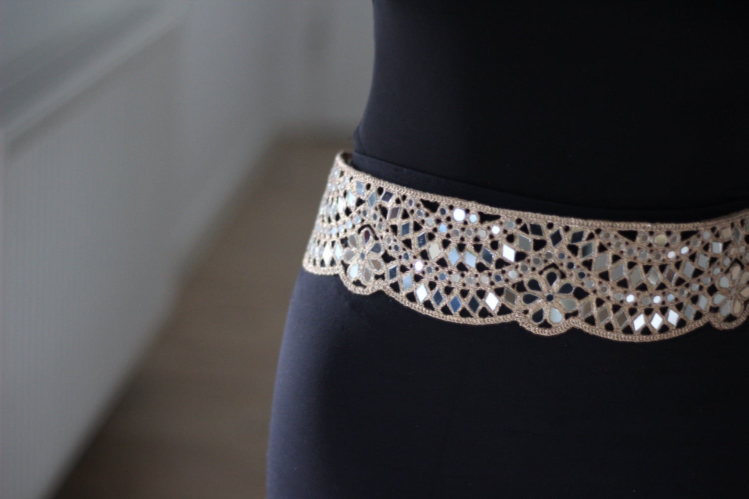 Producto hecho a mano utilizando hilos dorados, metalizados y de oro rosado con pequeñas piezas de espejos engarzadas en los tejidos.