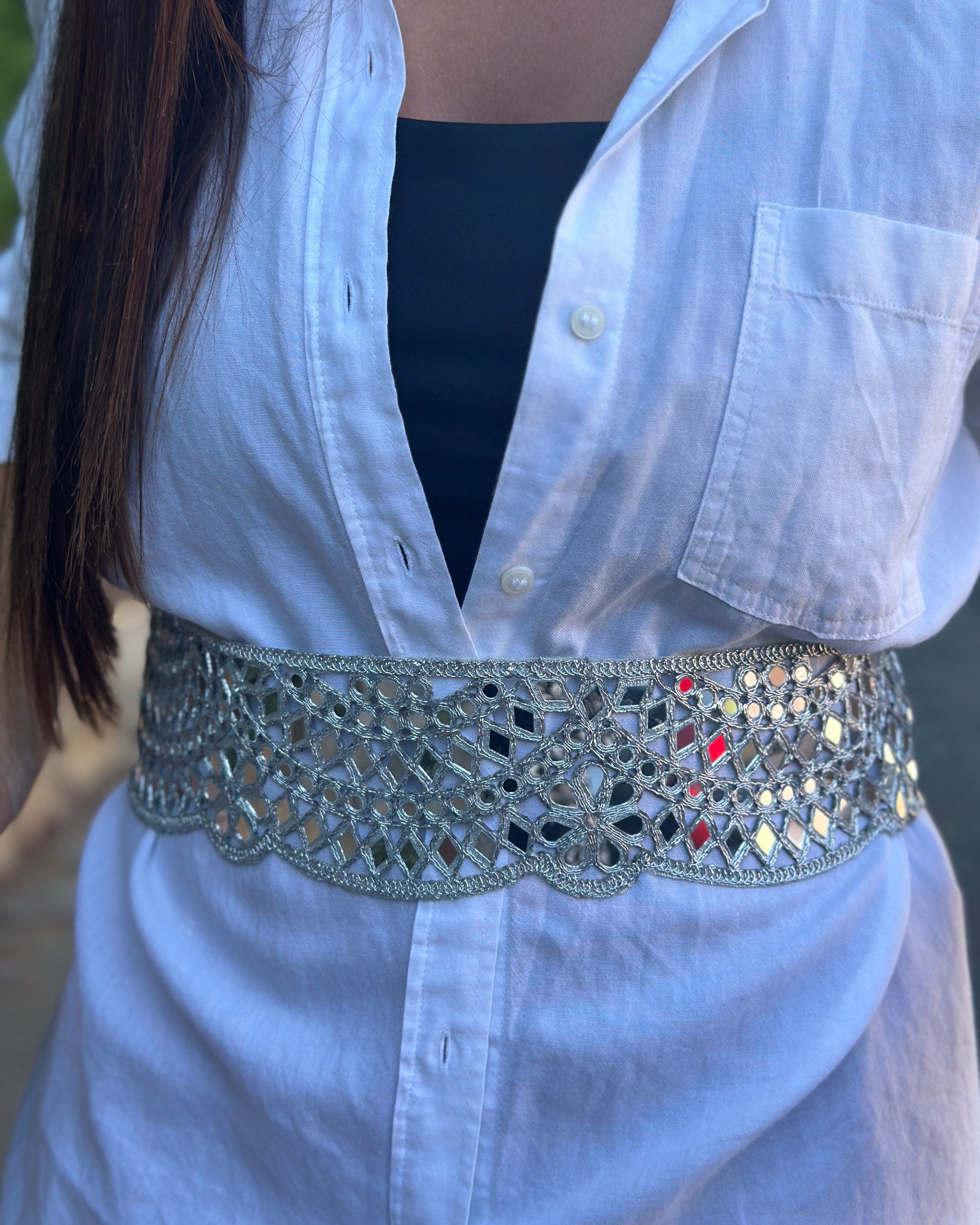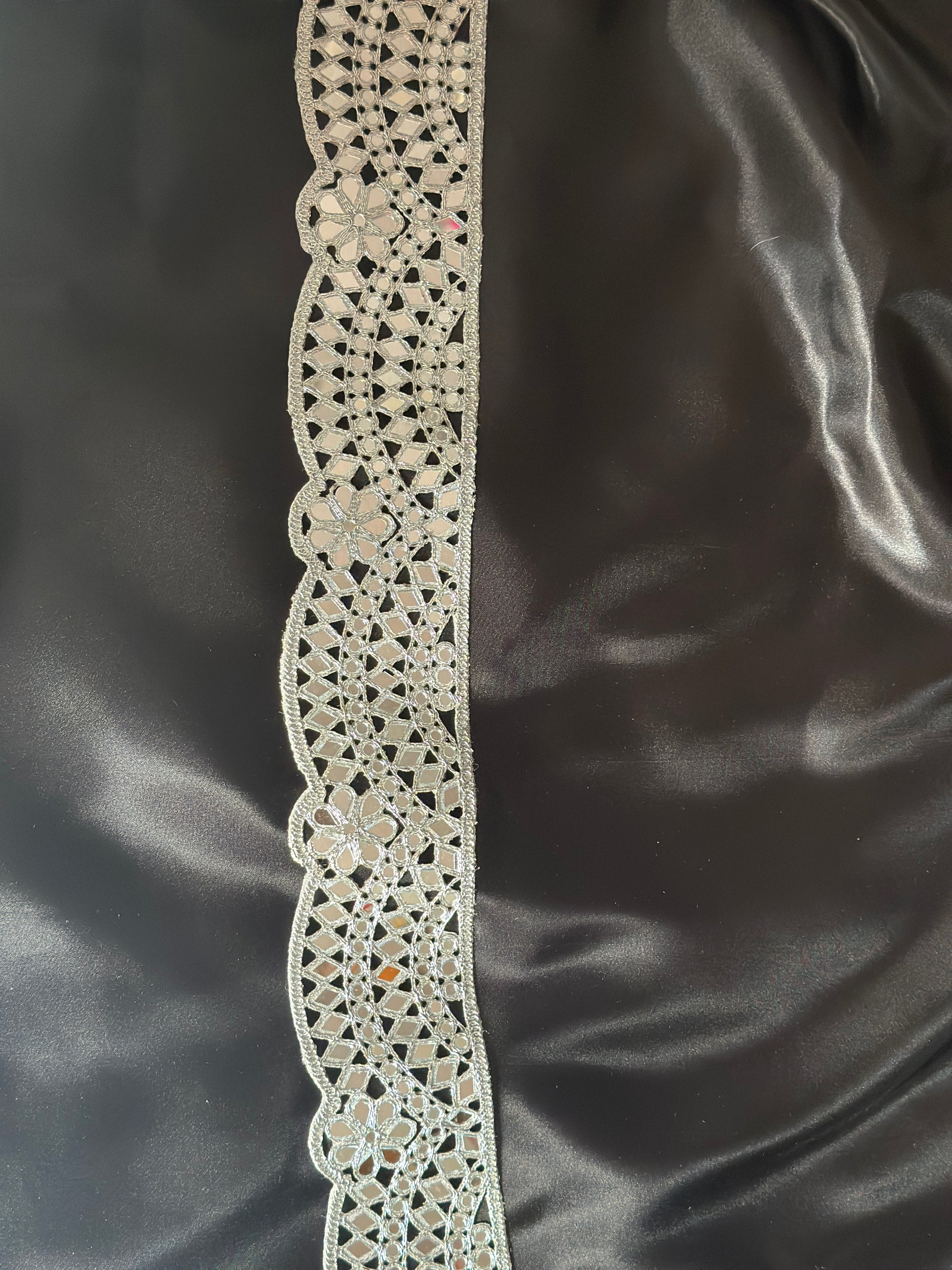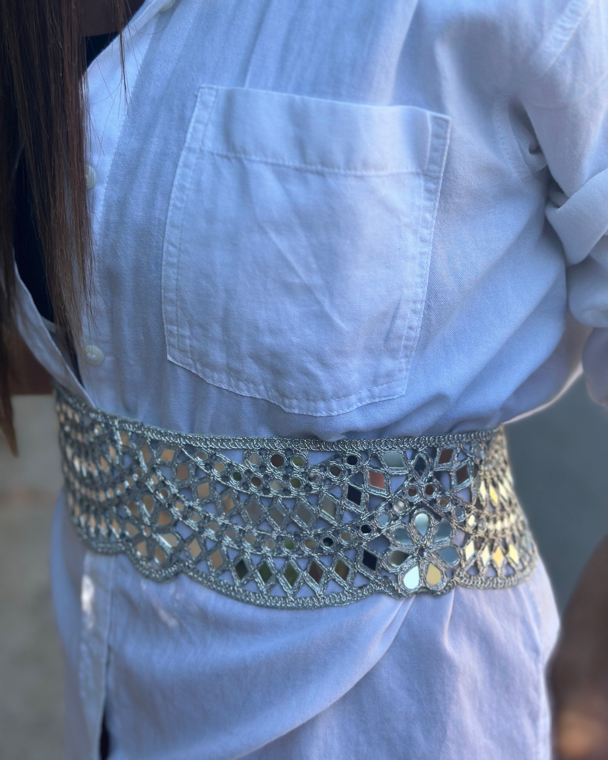 Producto hecho a mano utilizando hilos dorados, metalizados y de oro rosado con pequeñas piezas de espejo engarzadas en los tejidos.