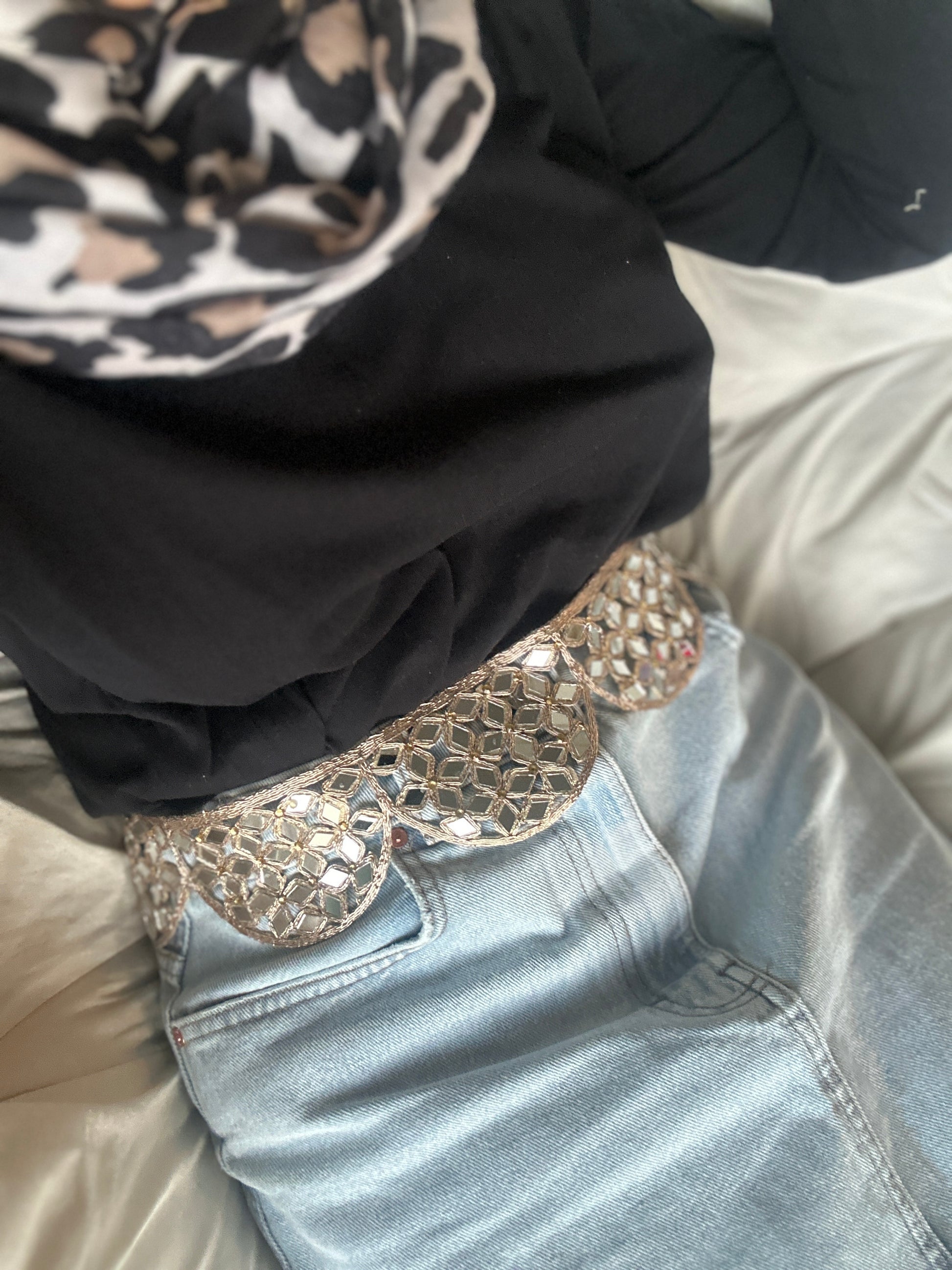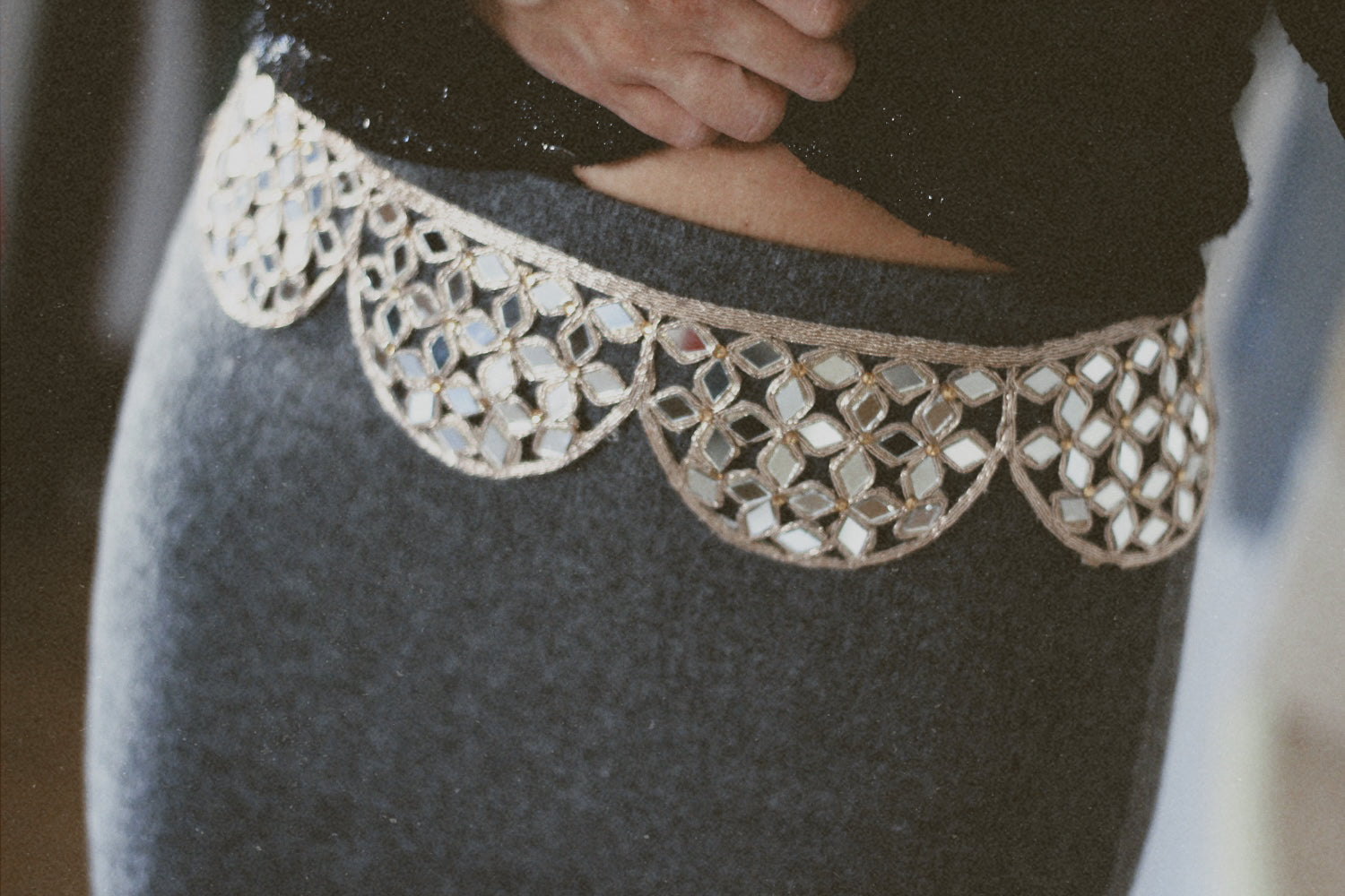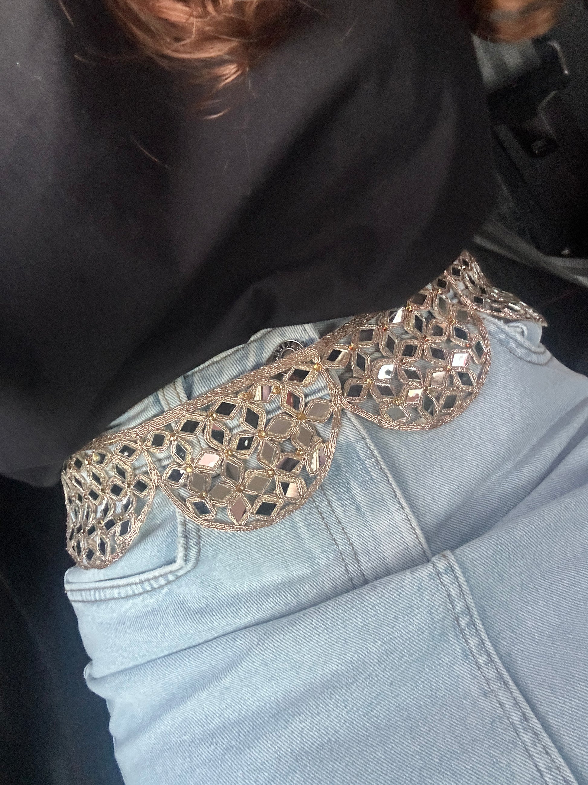 Producto hecho a mano utilizando hilos dorados, metalizados y de oro rosado con pequeñas piezas de espejo engarzadas en los tejidos.