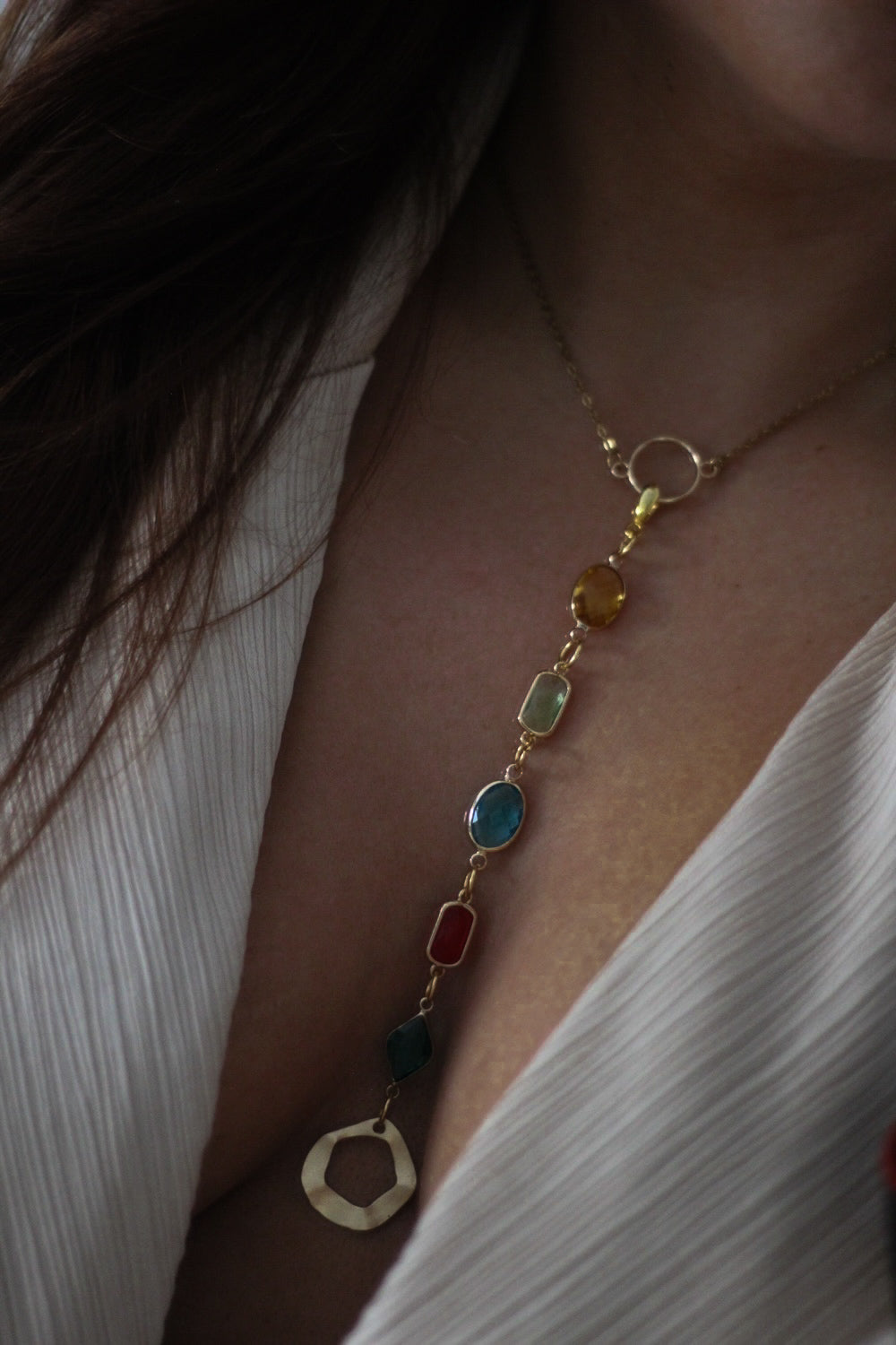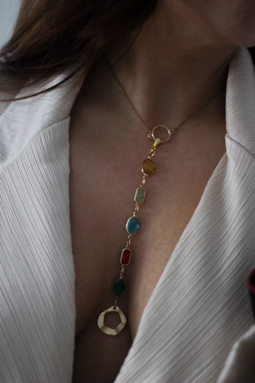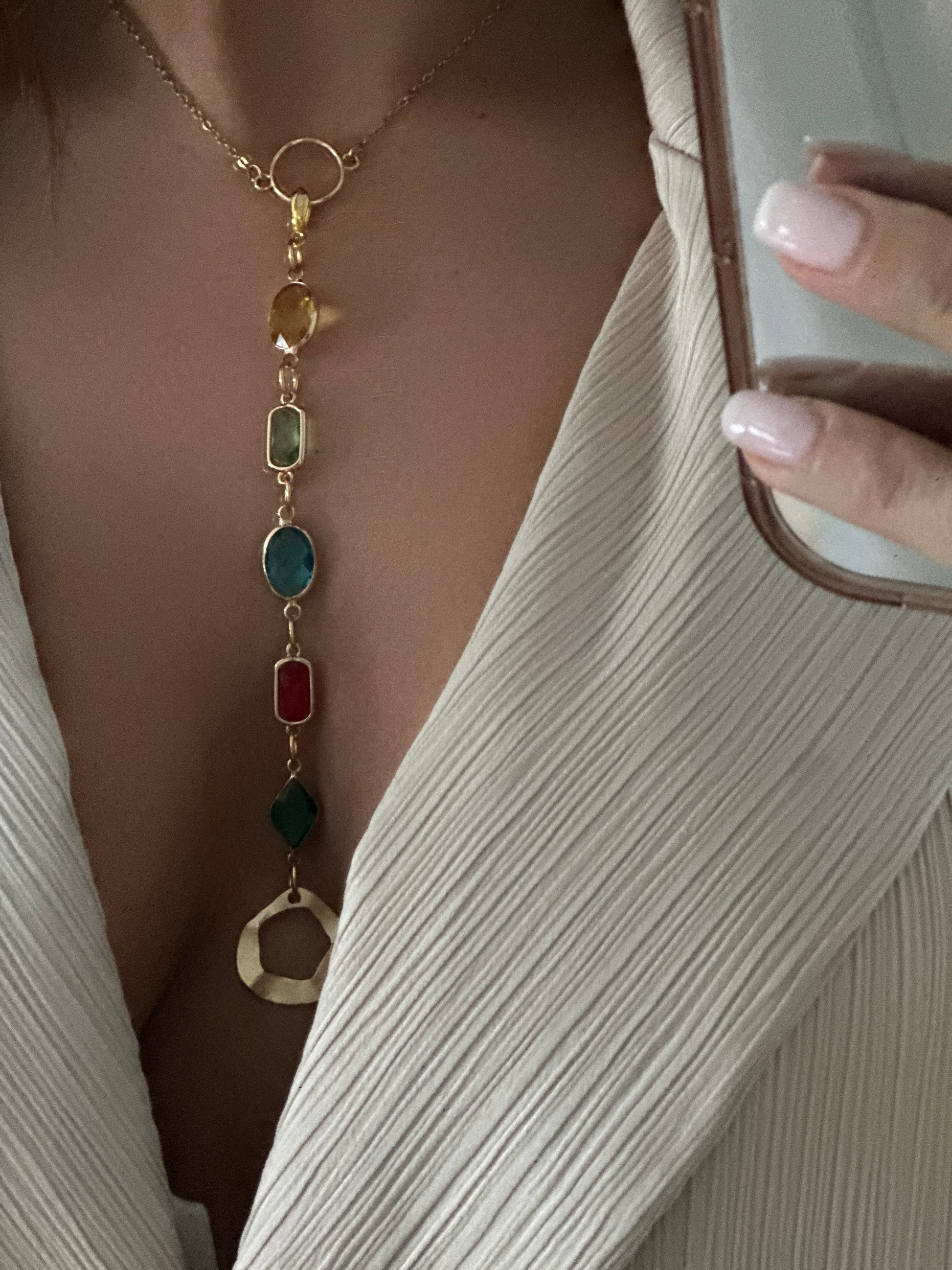 Un collar de acero inoxidable fino con forma de Y, con piedras de colores, perfecto para cualquier ocasión.