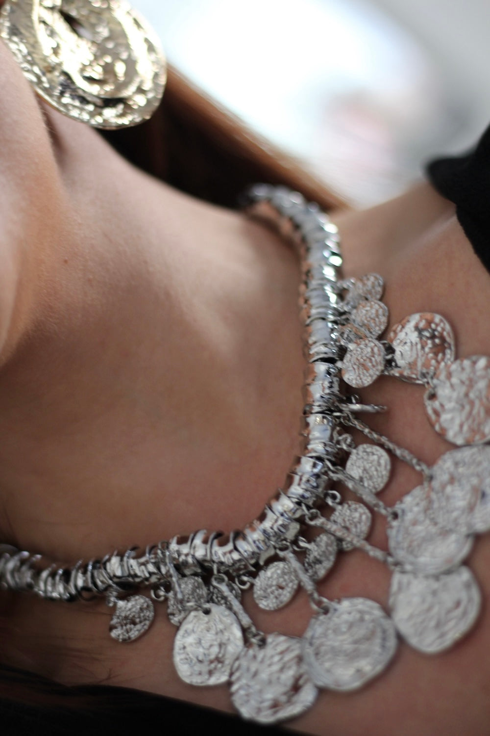 Maxi Collar plateado con monedas y eslabones metálicos de estilo vintage boho.