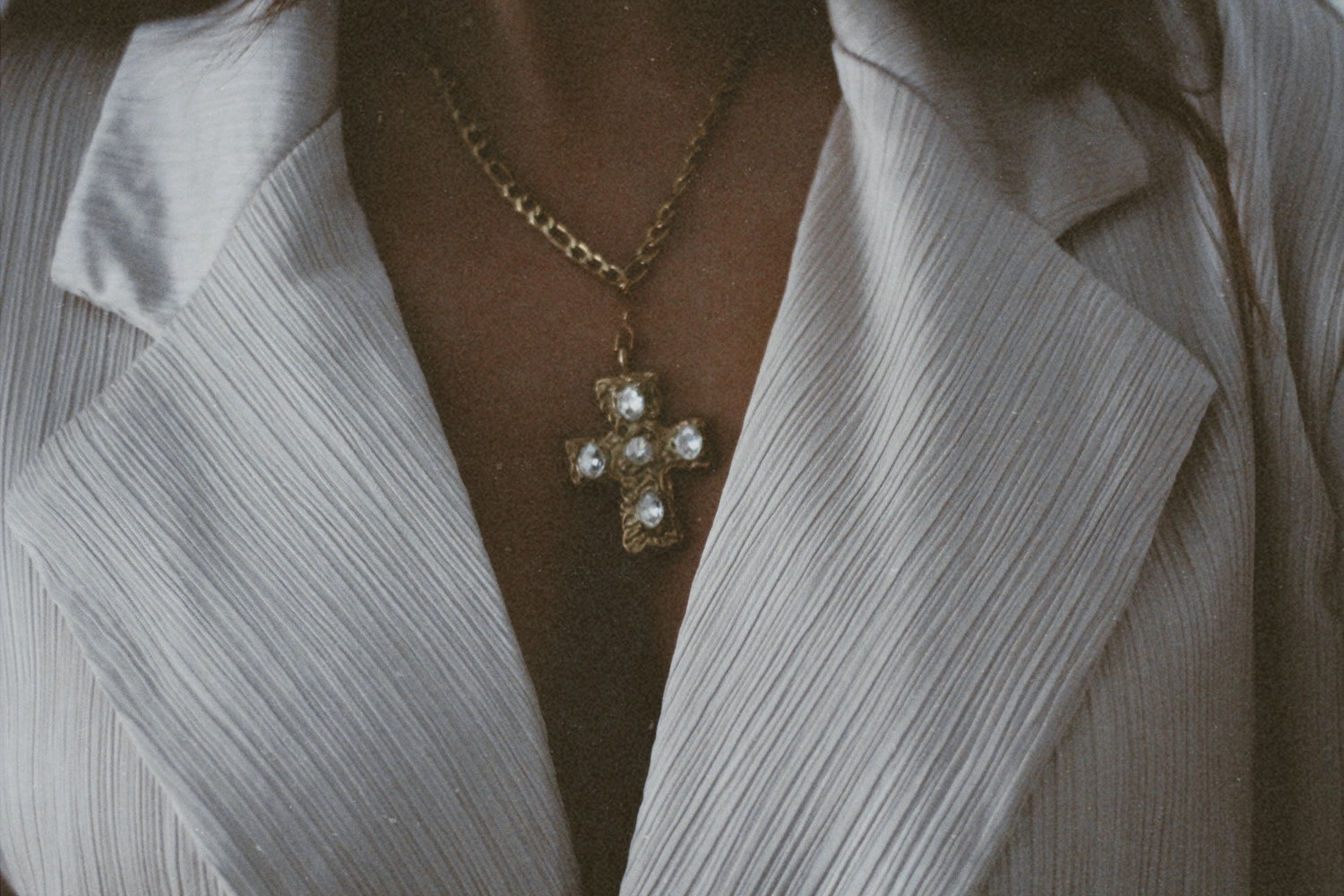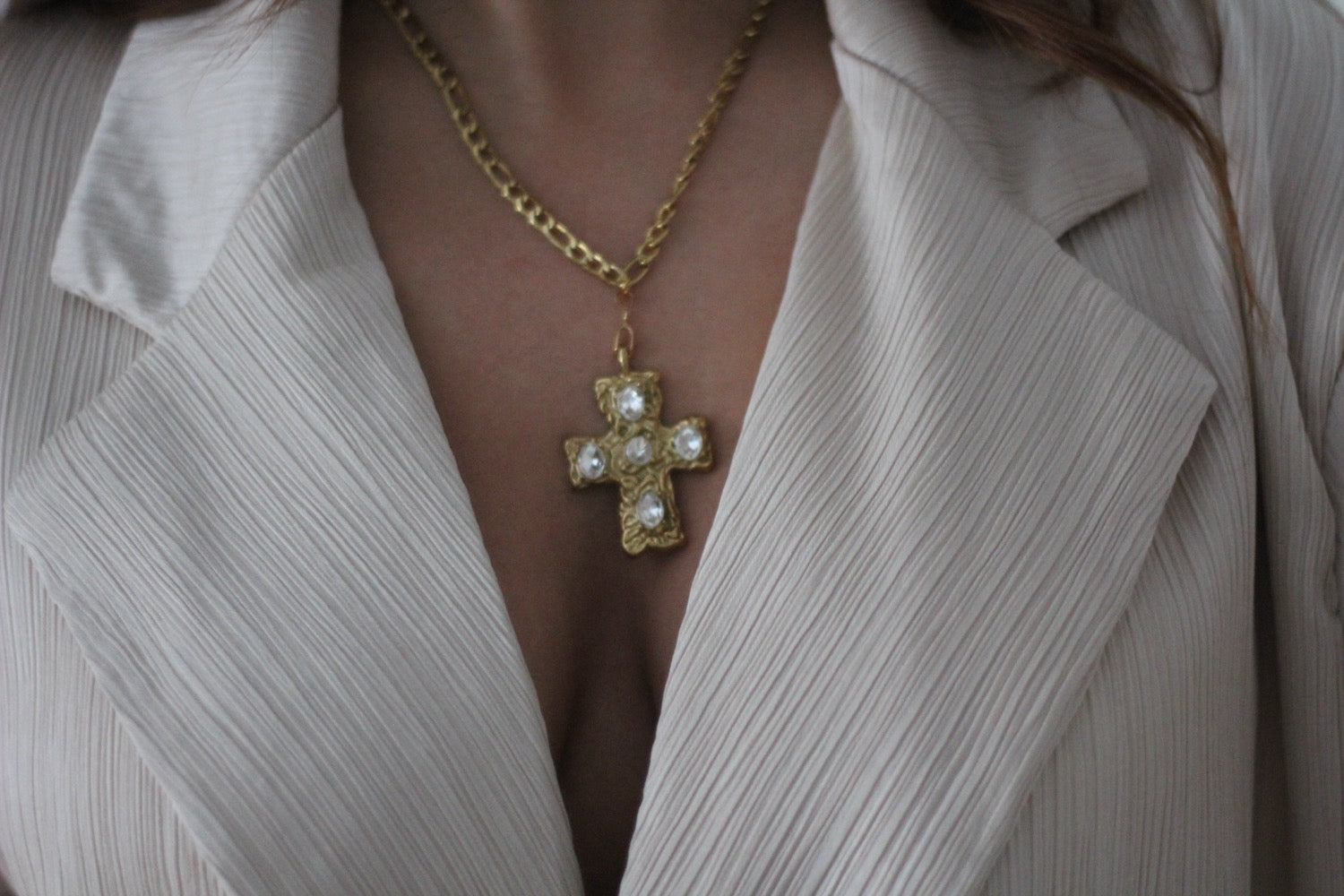 Colgante Cruz Gloria de acero inoxidable chapado en oro de 18k. Engarzado con cristales artificiales.