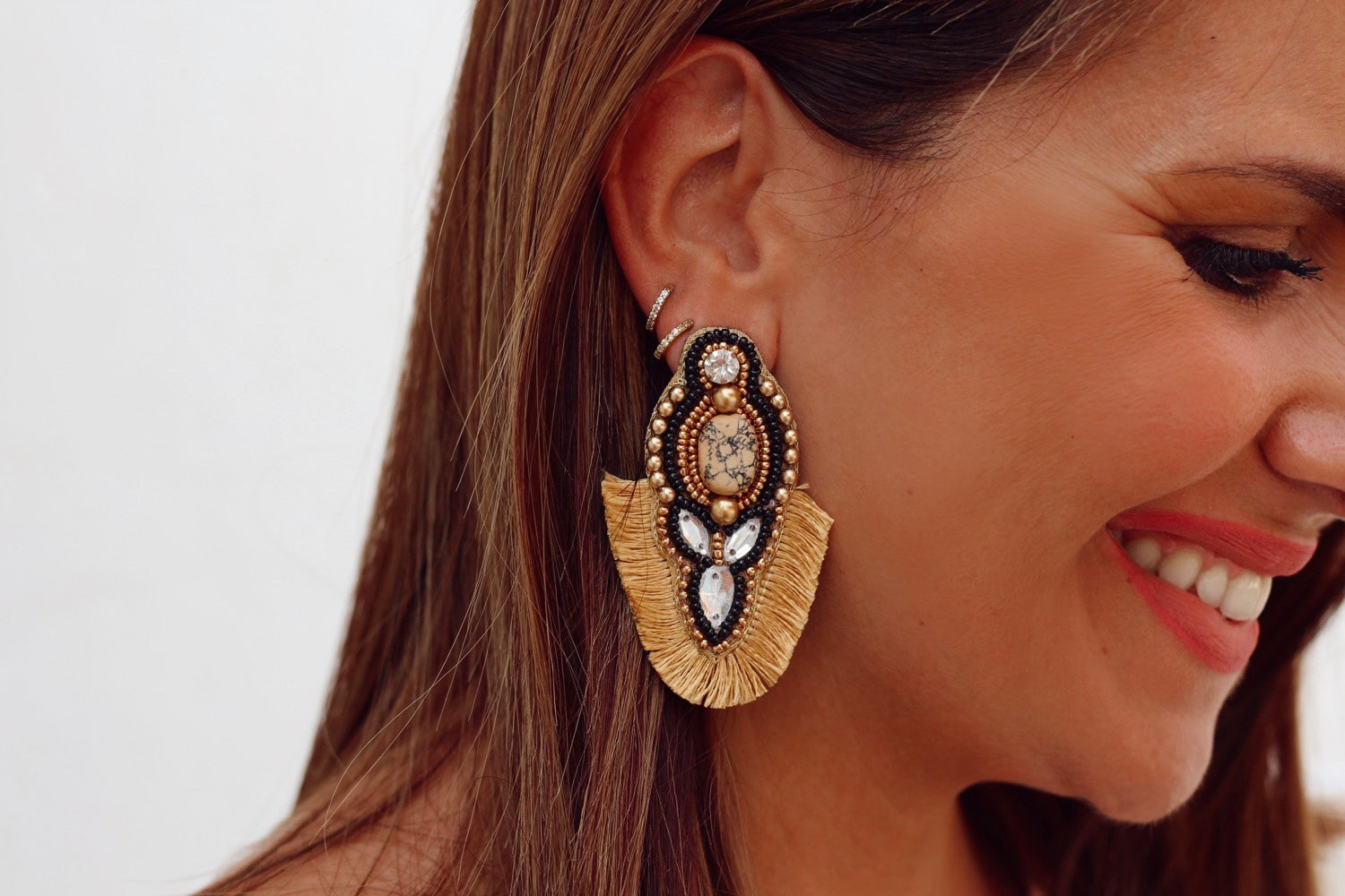 Pendientes tribales realizados con una composición de abalorios, piedras y tela en forma de flecos. De color dorado, negro y blanco.